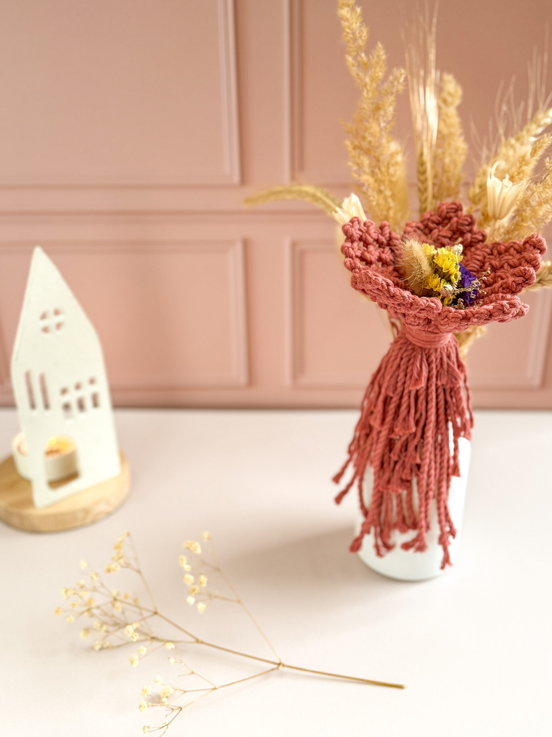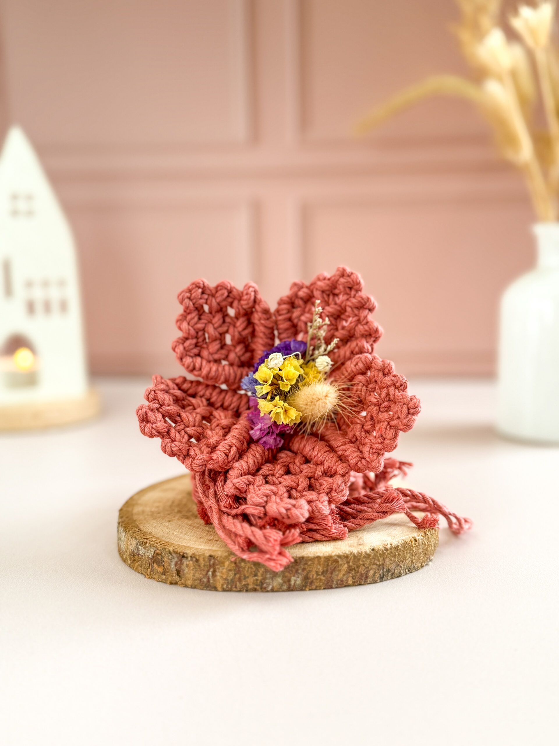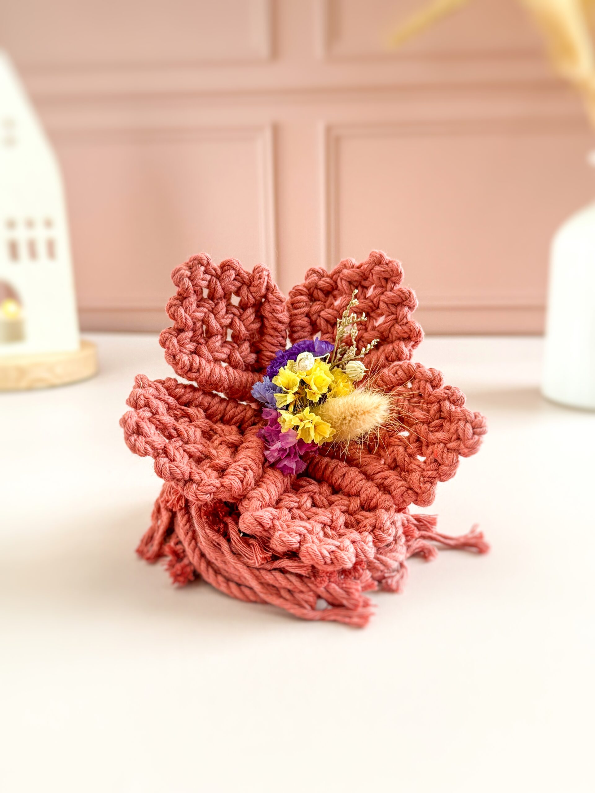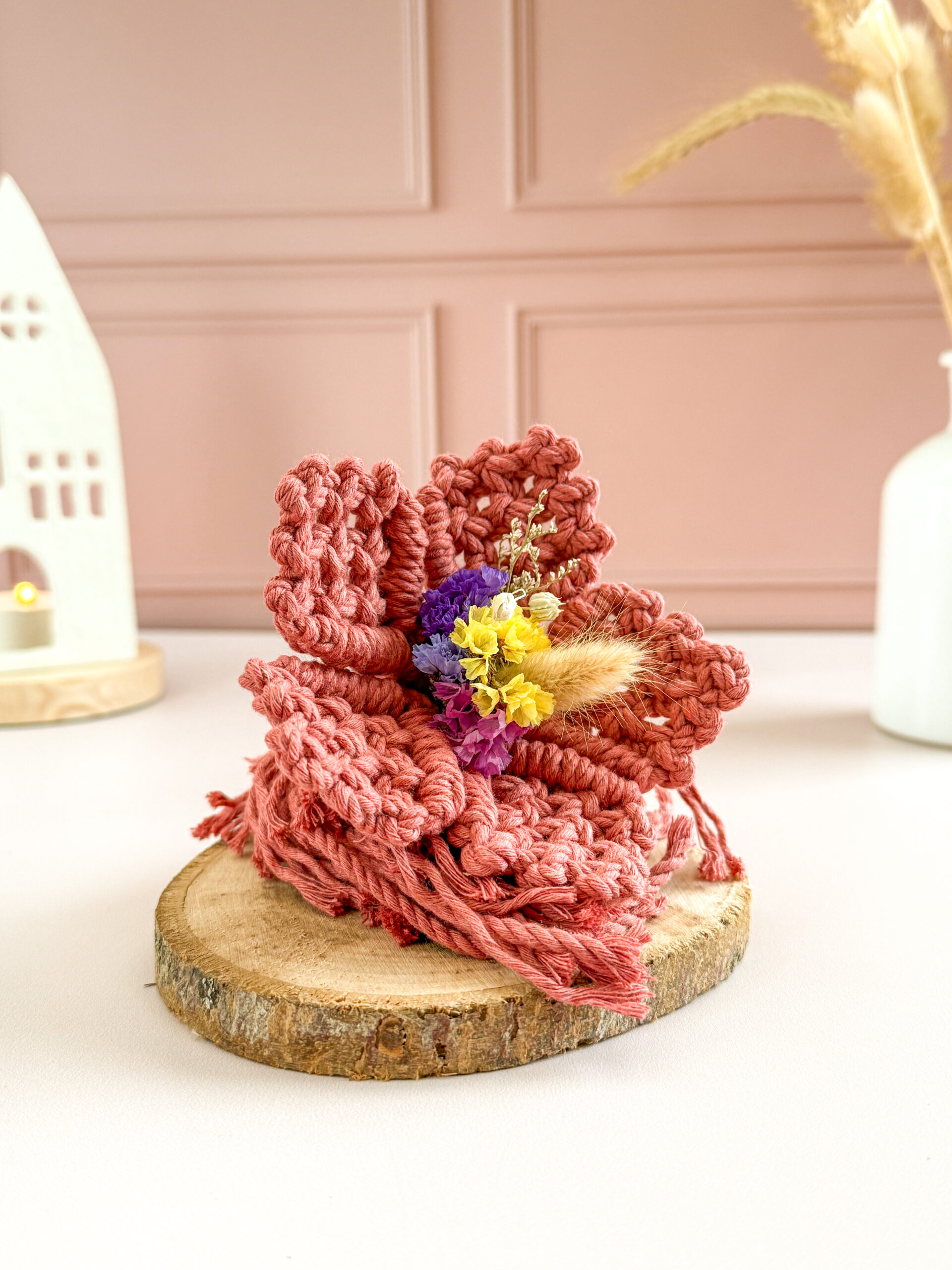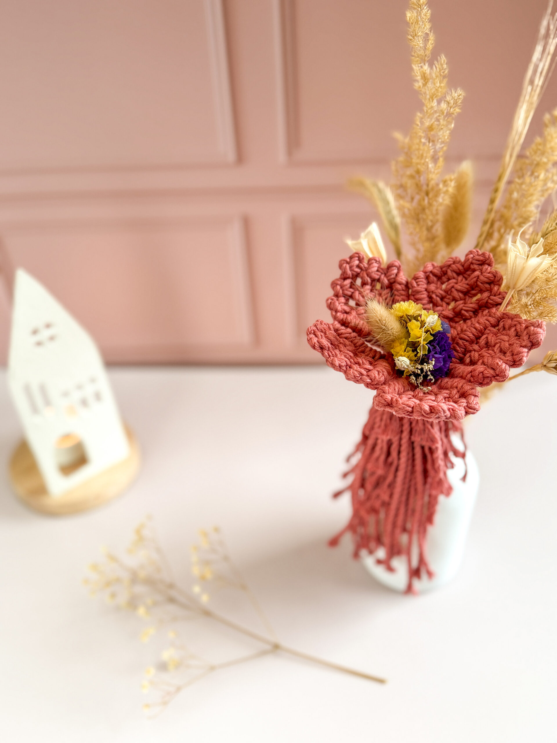 Cette fleur éternelle est une création artisanale tissée entièrement à la main en macramé. Elle mesure environ 20 cm de long pour 12 cm de large, un format idéal pour habiller une étagère ou être glissée dans un vase pour une touche poétique et naturelle.