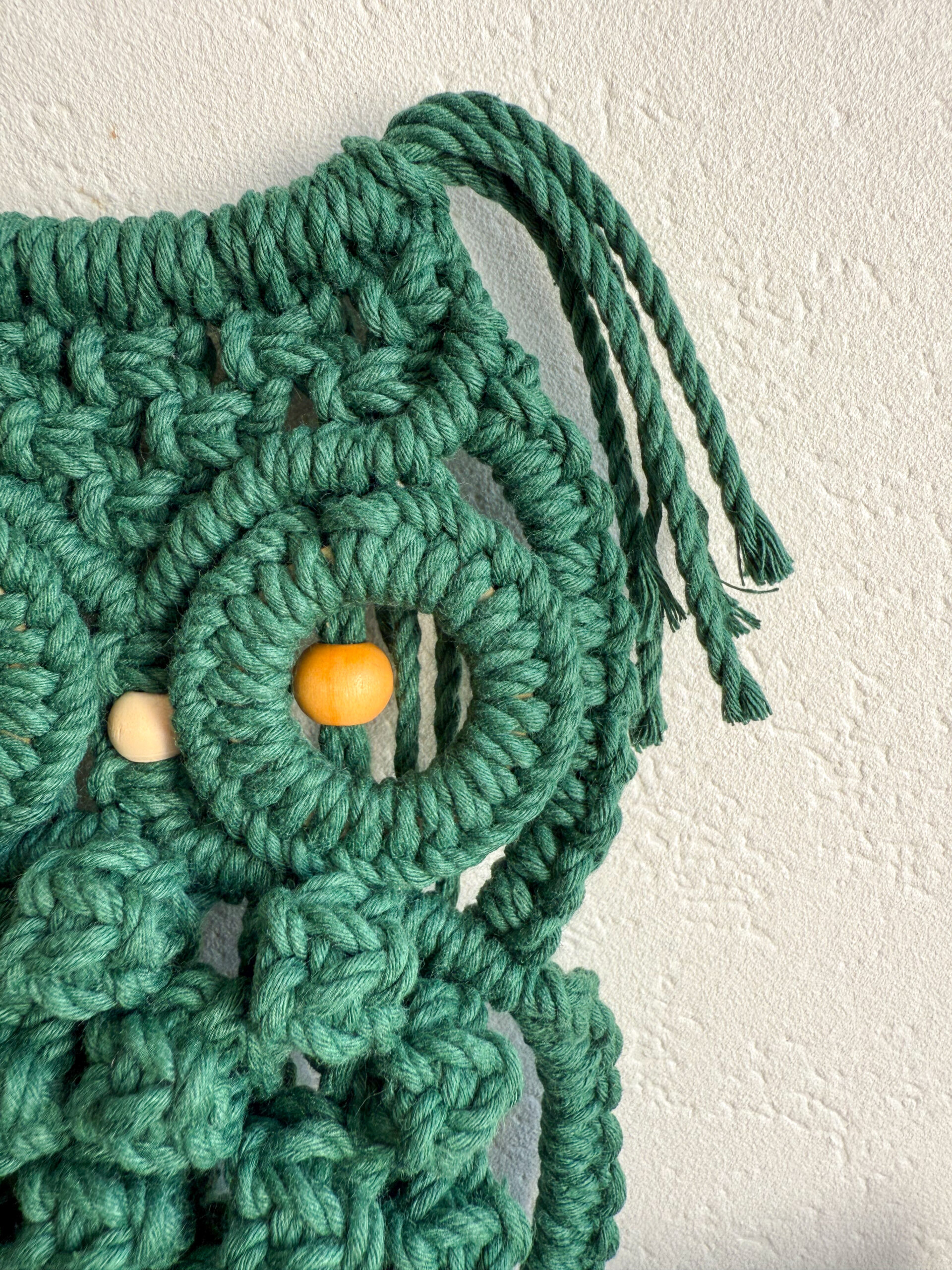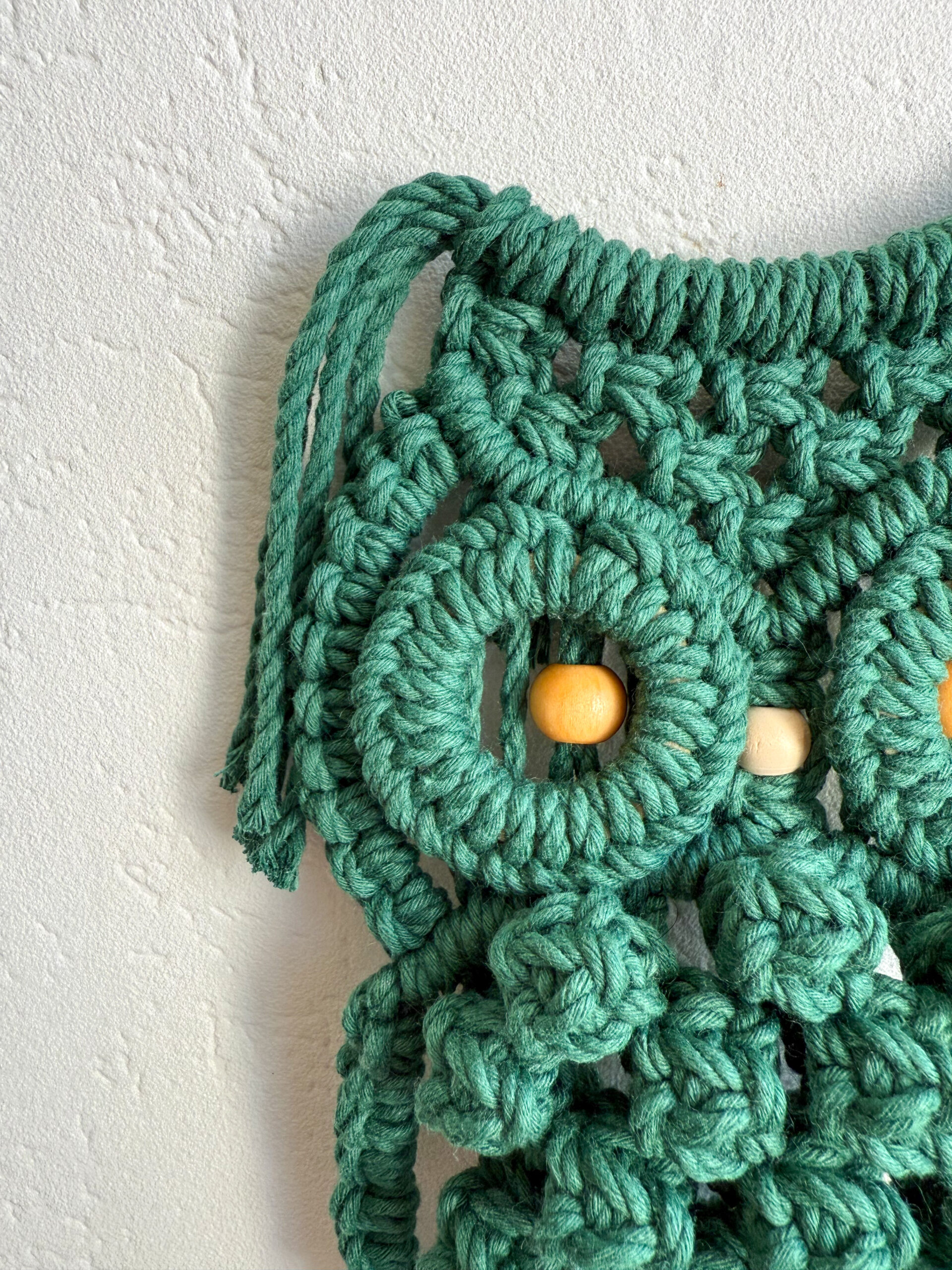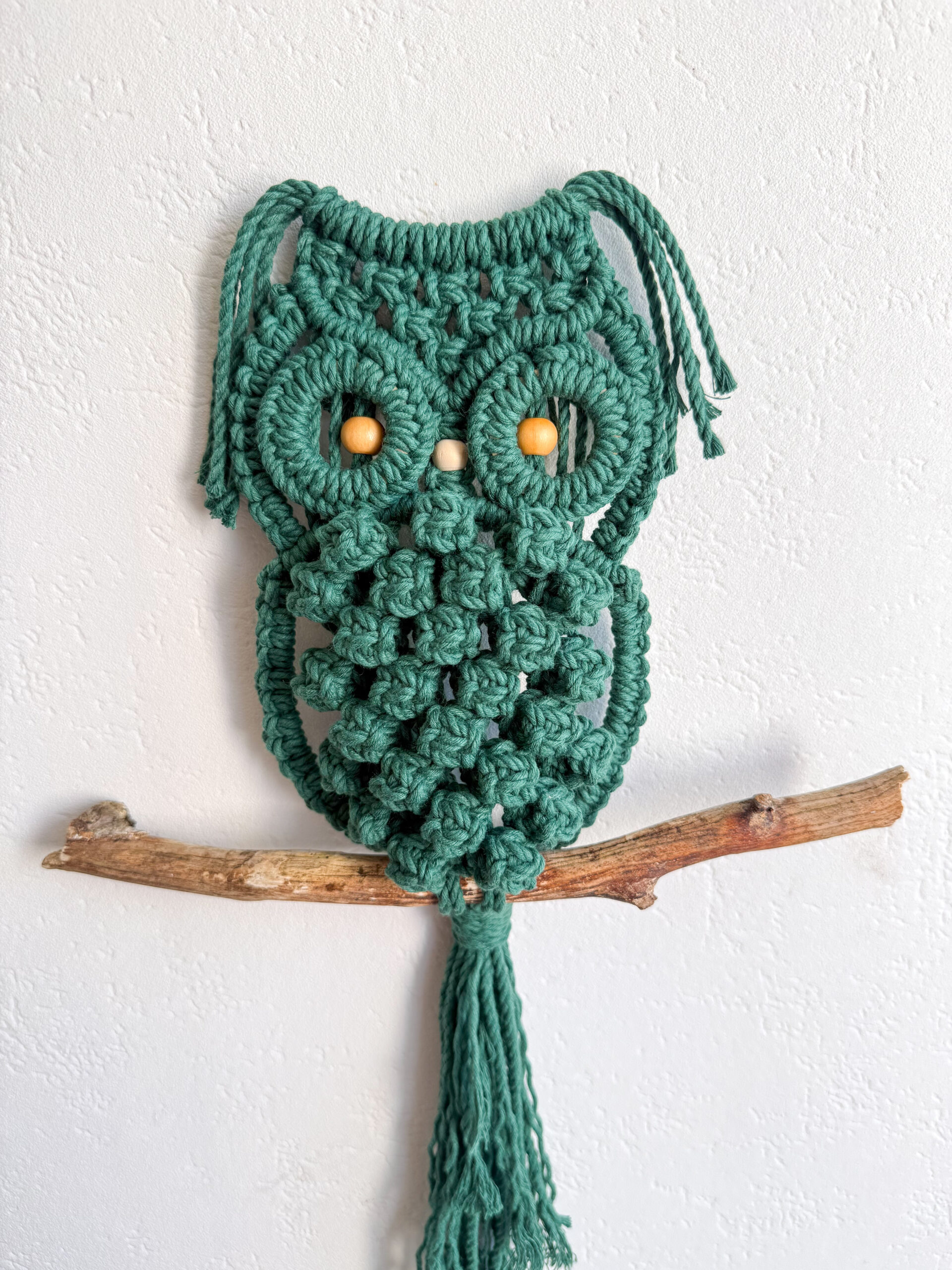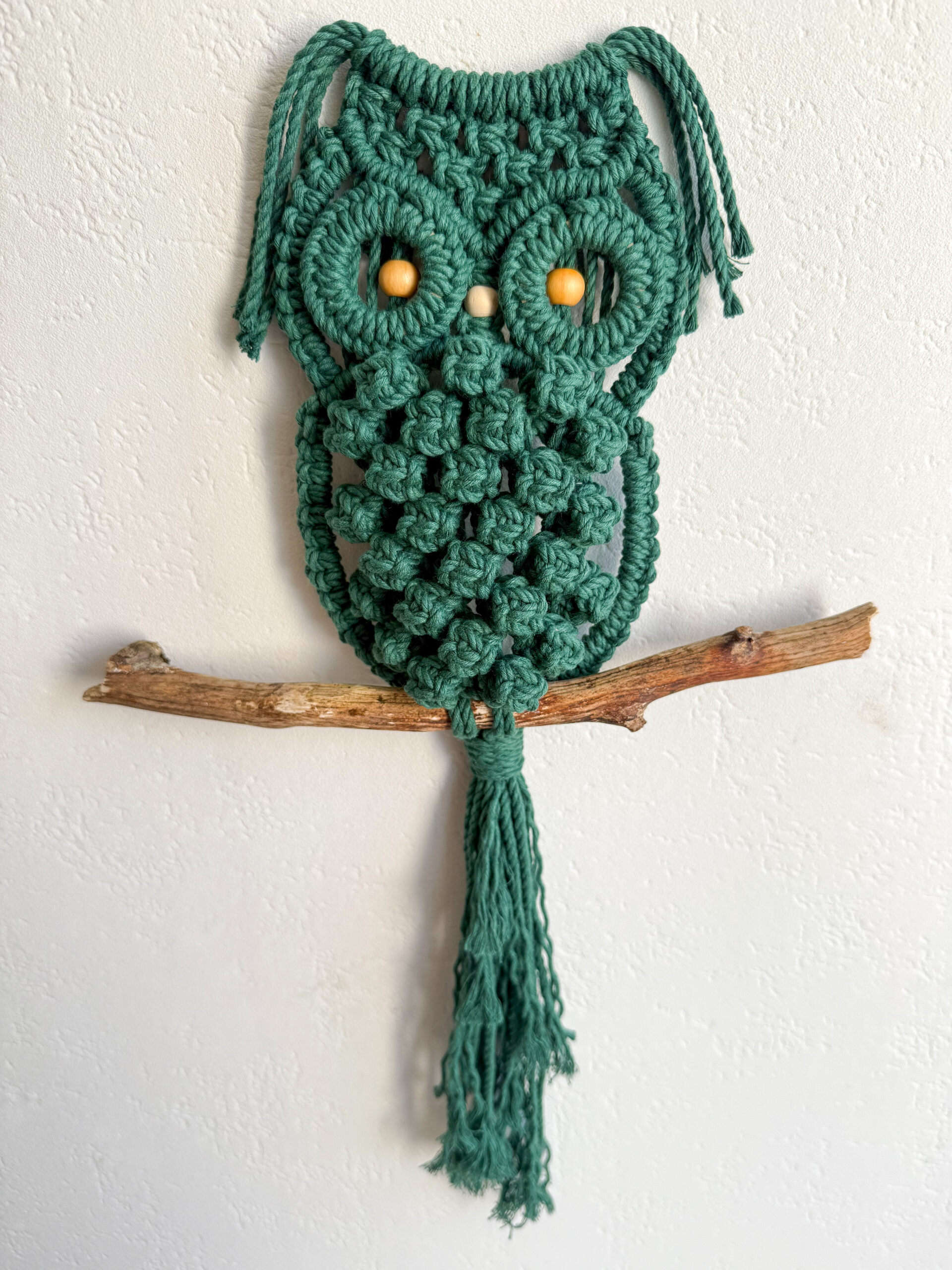 Hibou mural en macramé, entièrement noué a la main en coton et monté sur bois flotté.